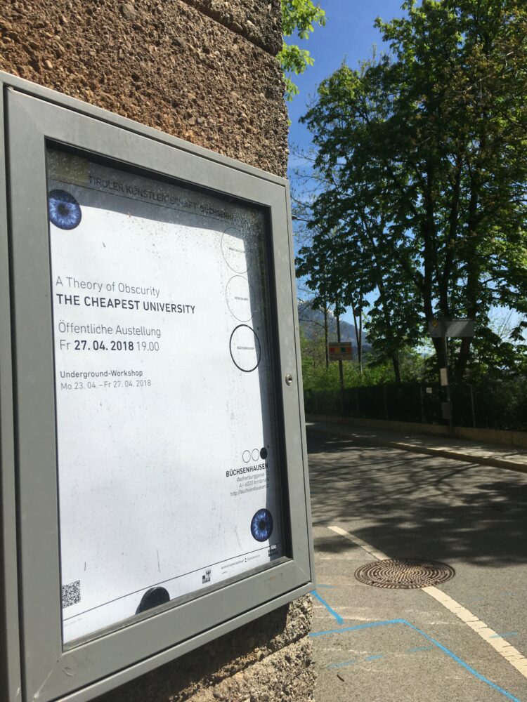 The Cheapest University maintained a recurring presence at Treignac Projet (Corrèze, France) and was invited to organize workshops and programs at La Salle de Bain (Lyon, 2018), Künstlerhaus Büchsenhausen (Innsbruck, Austria, 2018), erg (Brussels, 2018), Paris Internationale (Paris, 2017) and Carreau du Temple (Paris, 2017).